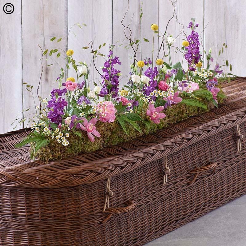 This natural-looking casket spray features a beautiful array of tones and blooms including craspedia, orchids, stocks, and clematis.